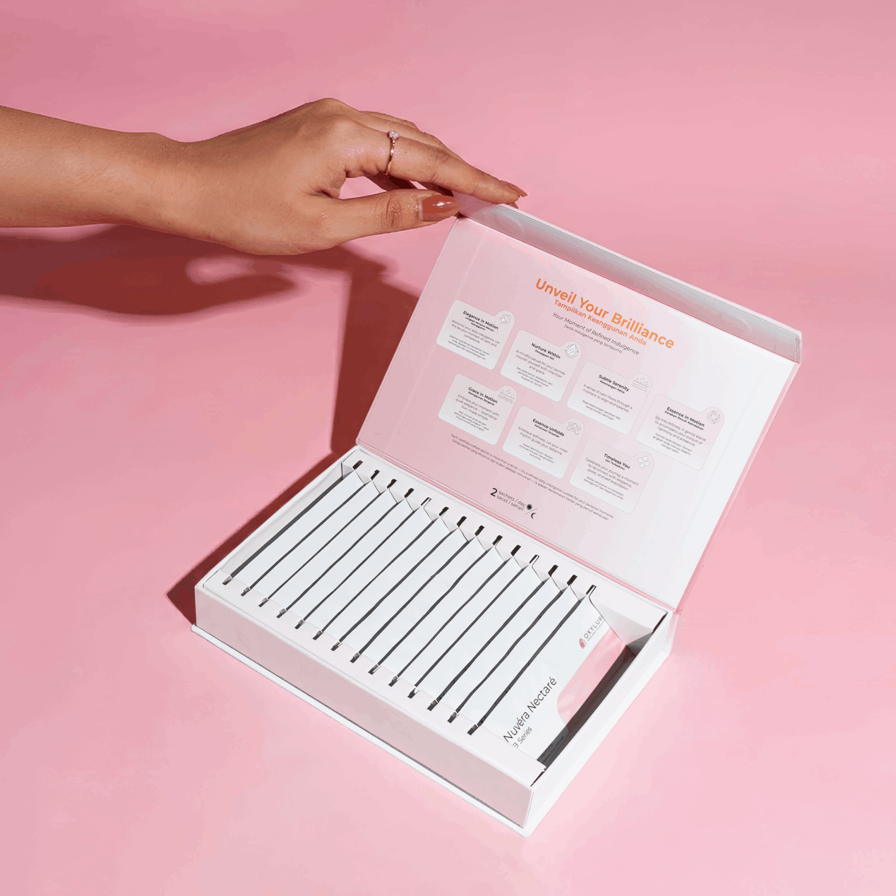 All these benefits come in a delicious peach-flavoured liquid sachet that’s easy to enjoy daily — because true beauty starts from within.